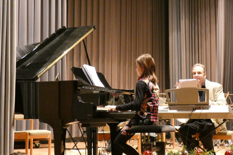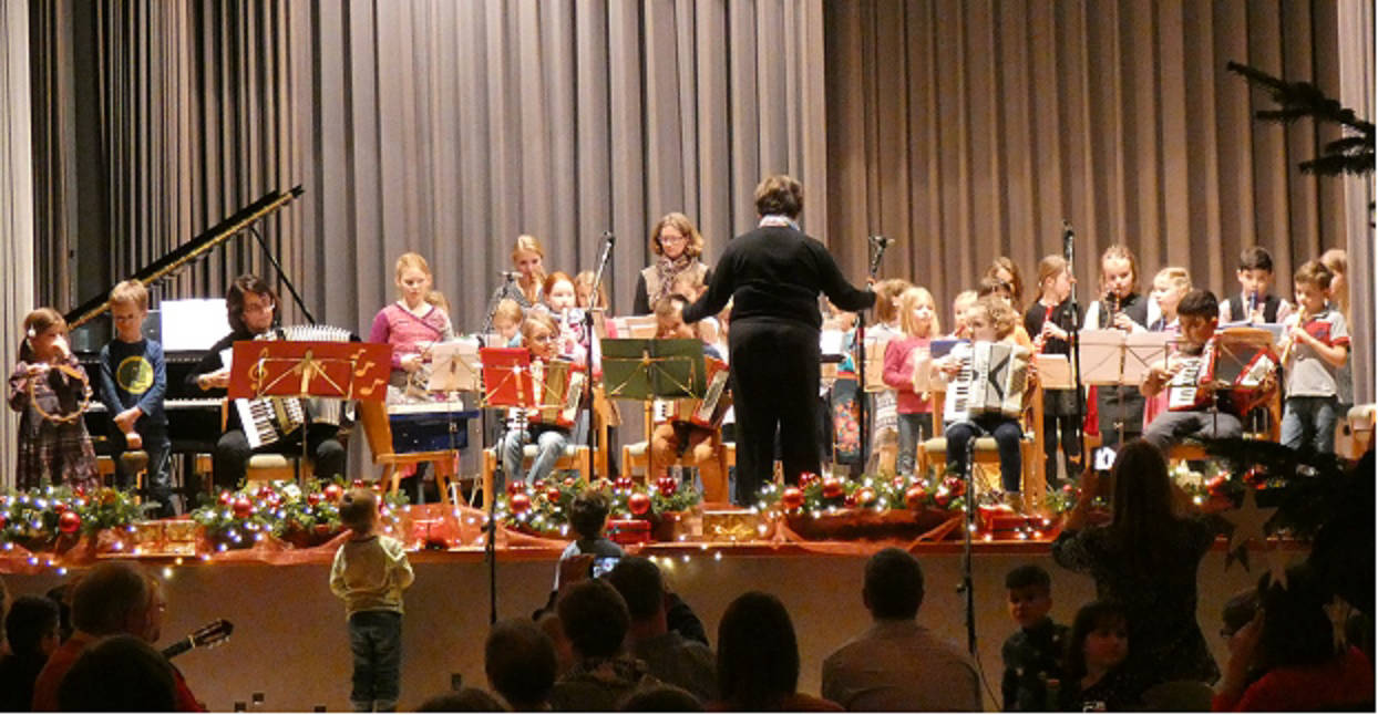Am vergangenen Samstag feierte die Musikschule Rutesheim -1 . HHS in voll besetzter, weihnachtlich geschmückter Festhalle ihre Jahresabschlussfeier. Wir freuen uns ganz beson-ders, unsere neue Bürgermeisterin Frau Susanne Widmaier begrüßen zu dürfen. Das AkkO (Akkordeon-Orchester) unter der Leitung von Mihajlo Rajkovic eröffnete den Musikreigen mit weihnachtlichen Klängen, schmissigen Ohrwürmern und aktuellen Hits. Unter dem Motto „Weihnachten in aller Welt“ zeigten viele Schüler, angefangen bei den Kindern der rhythmisch musikalischen Früherziehung (Musimo), über Flöten-, Gitarren-, Keyboard- und Klavierspieler bis hin zu Schüler der Akkordeon-AG wie in verschiedensten Ländern Weihnachten gefeiert wird. Mit einem ganz bunten abwechslungsreichen Programm erfreuten die Musikanten die zahlreichen Gäste, die dies mit anhaltendem Applaus belohnten.