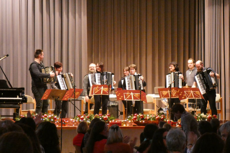 Am vergangenen Samstag feierte die Musikschule Rutesheim -1 . HHS in voll besetzter, weihnachtlich geschmückter Festhalle ihre Jahresabschlussfeier. Wir freuen uns ganz beson-ders, unsere neue Bürgermeisterin Frau Susanne Widmaier begrüßen zu dürfen. Das AkkO (Akkordeon-Orchester) unter der Leitung von Mihajlo Rajkovic eröffnete den Musikreigen mit weihnachtlichen Klängen, schmissigen Ohrwürmern und aktuellen Hits. Unter dem Motto „Weihnachten in aller Welt“ zeigten viele Schüler, angefangen bei den Kindern der rhythmisch musikalischen Früherziehung (Musimo), über Flöten-, Gitarren-, Keyboard- und Klavierspieler bis hin zu Schüler der Akkordeon-AG wie in verschiedensten Ländern Weihnachten gefeiert wird. Mit einem ganz bunten abwechslungsreichen Programm erfreuten die Musikanten die zahlreichen Gäste, die dies mit anhaltendem Applaus belohnten.